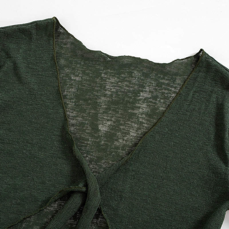 Mesh See-through Strap Long-sleeved Wrap Top And Skirt