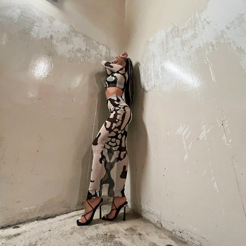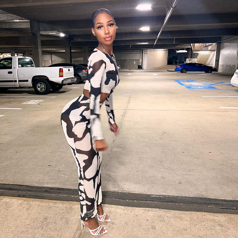 2023 New Mesh Printing Navelless Long-sleeved Slim Dress Suit