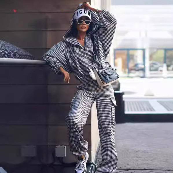 Art Retro Plaid Pocket Hooded Loose Temperament Two-piece Suit