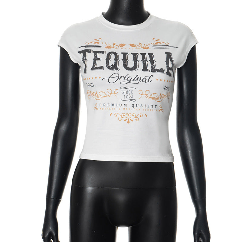 Comfortable Round Neck Letter Print Sleeve Fitted Short T-shirt