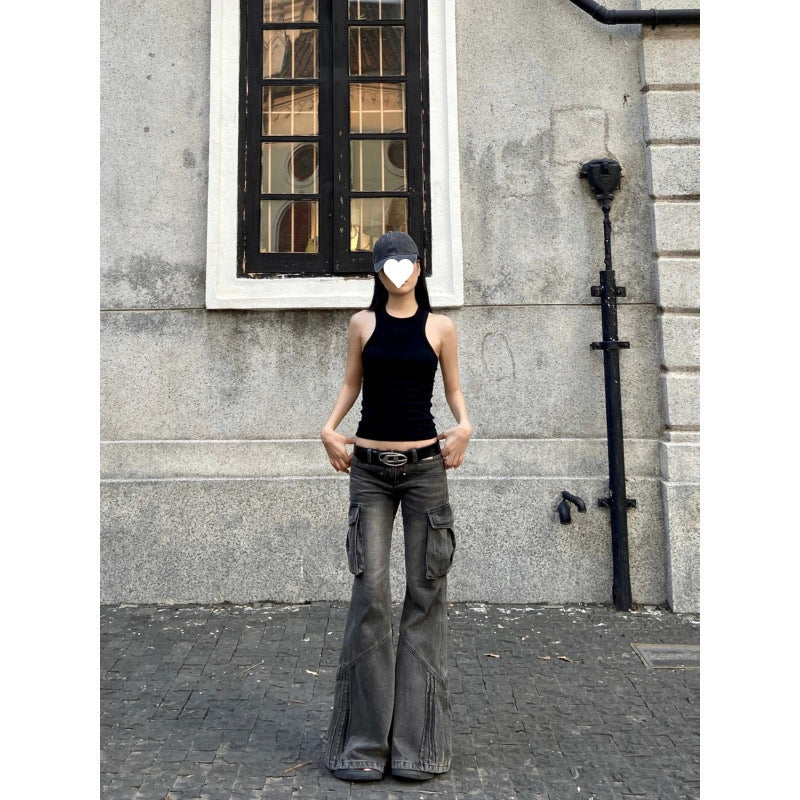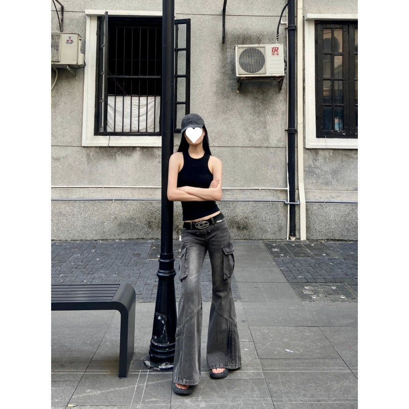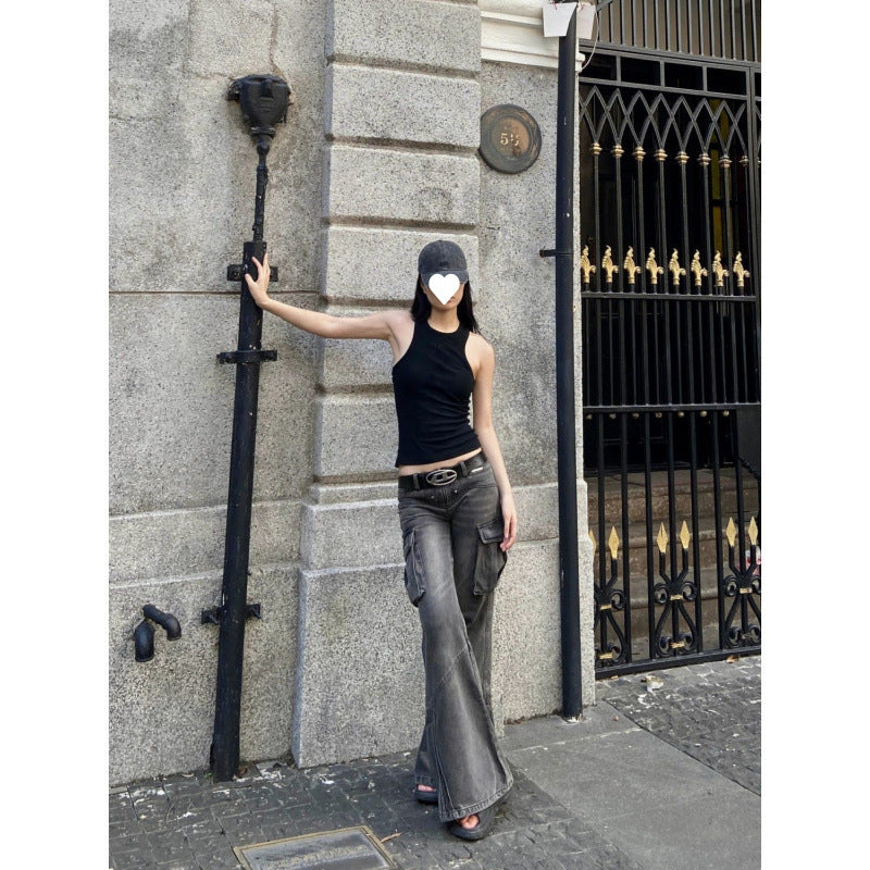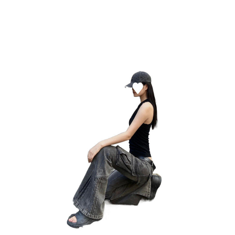Design Sense Heavy Industry Three-dimensional Low Waist Micro-pull Overalls