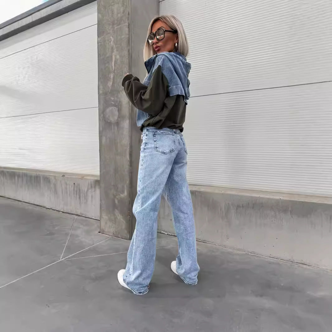 Fashion Loose Casual Washing Denim Stitching Hooded Women's Sweater