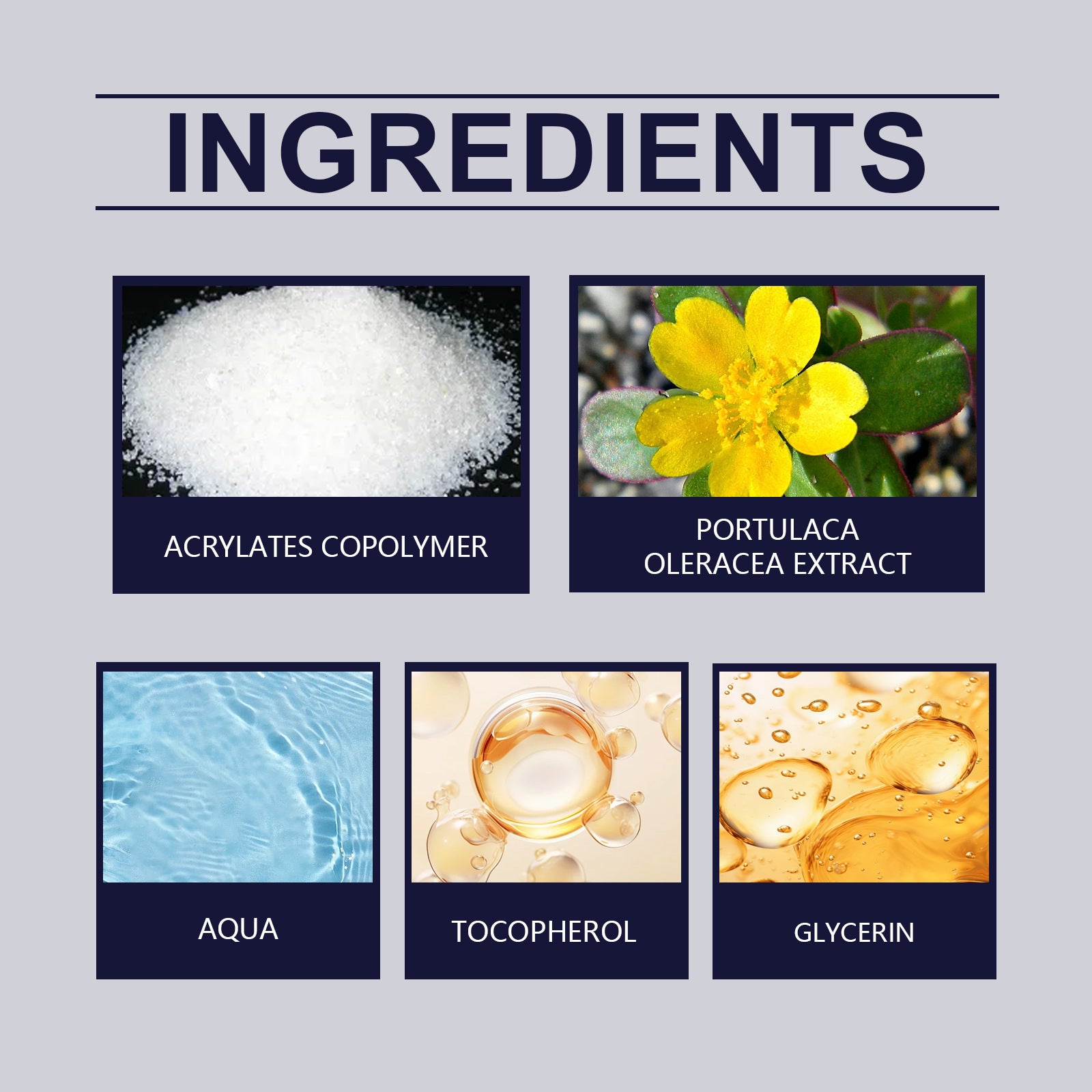 Ingredients: Water, acrylic cool copolymer, glycerin, tocopherol (vitamin E), purslane extract