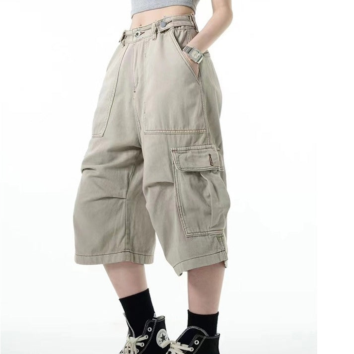 Khaki Wide Casual Shorts Workwear Three-dimensional Pocket