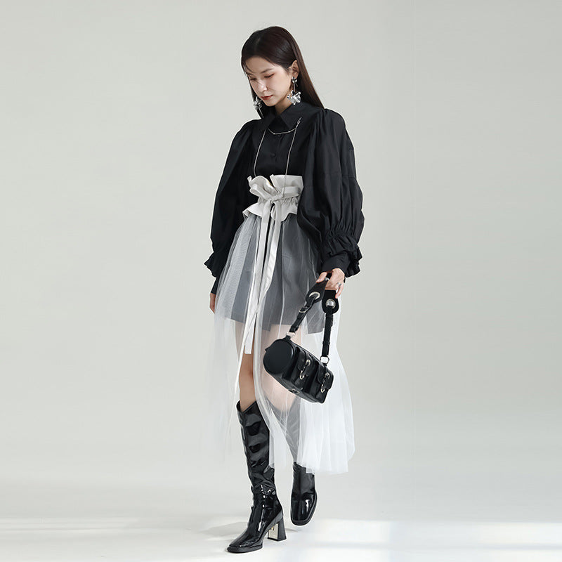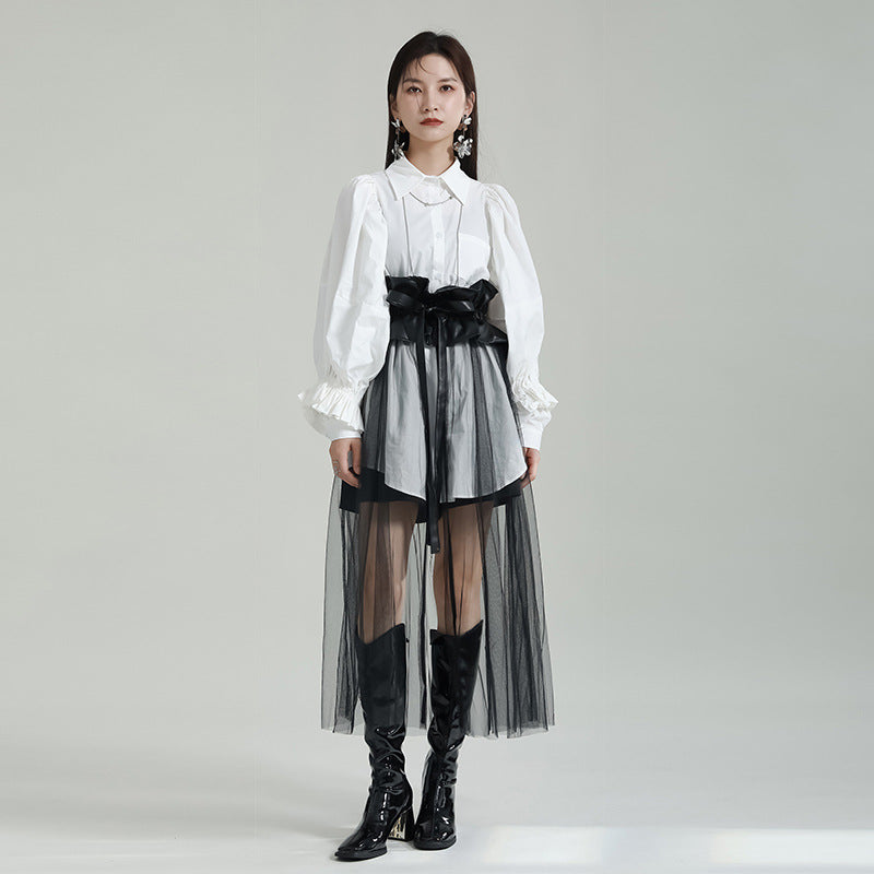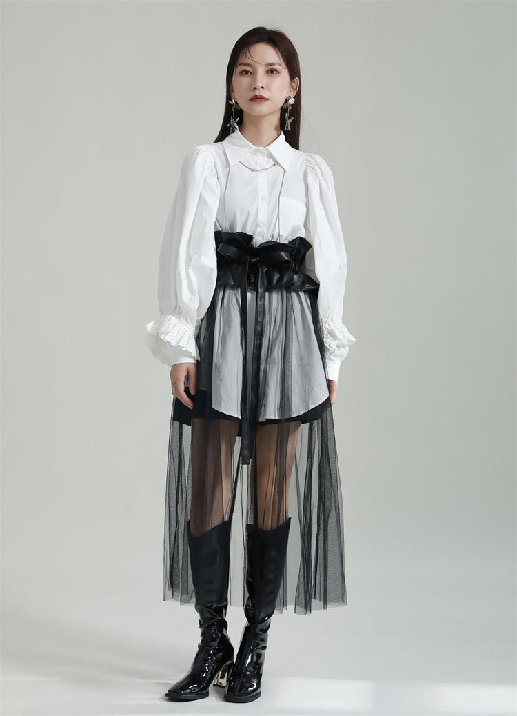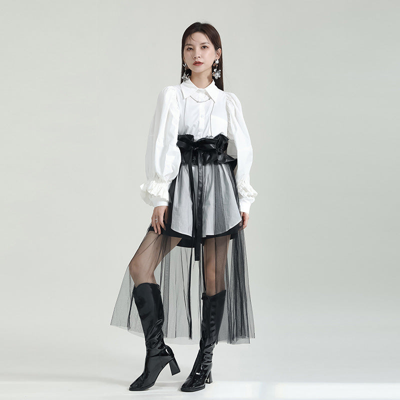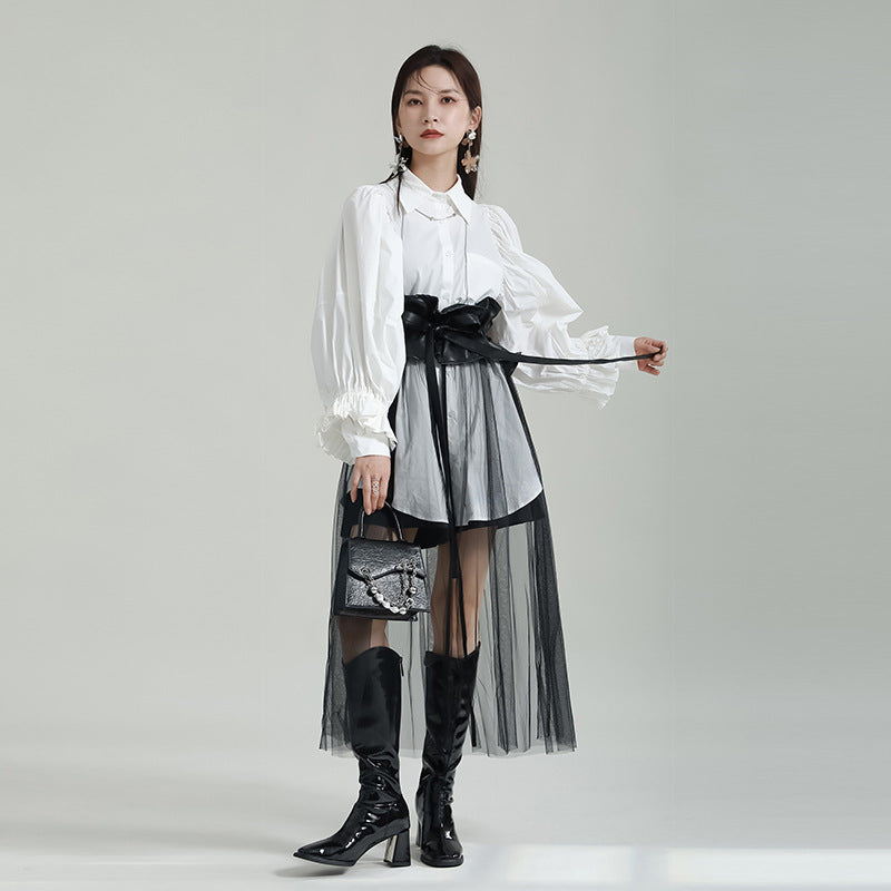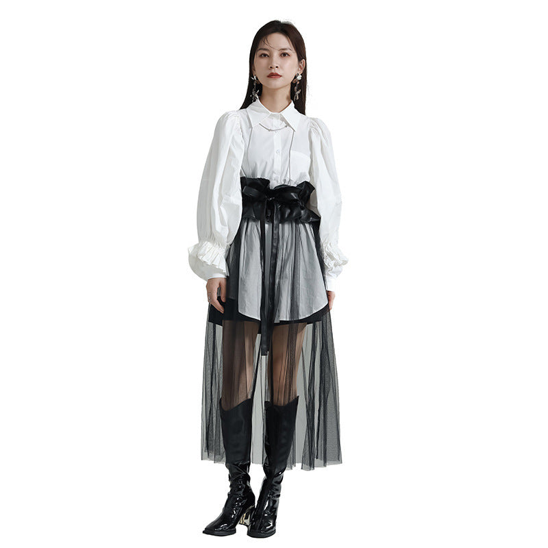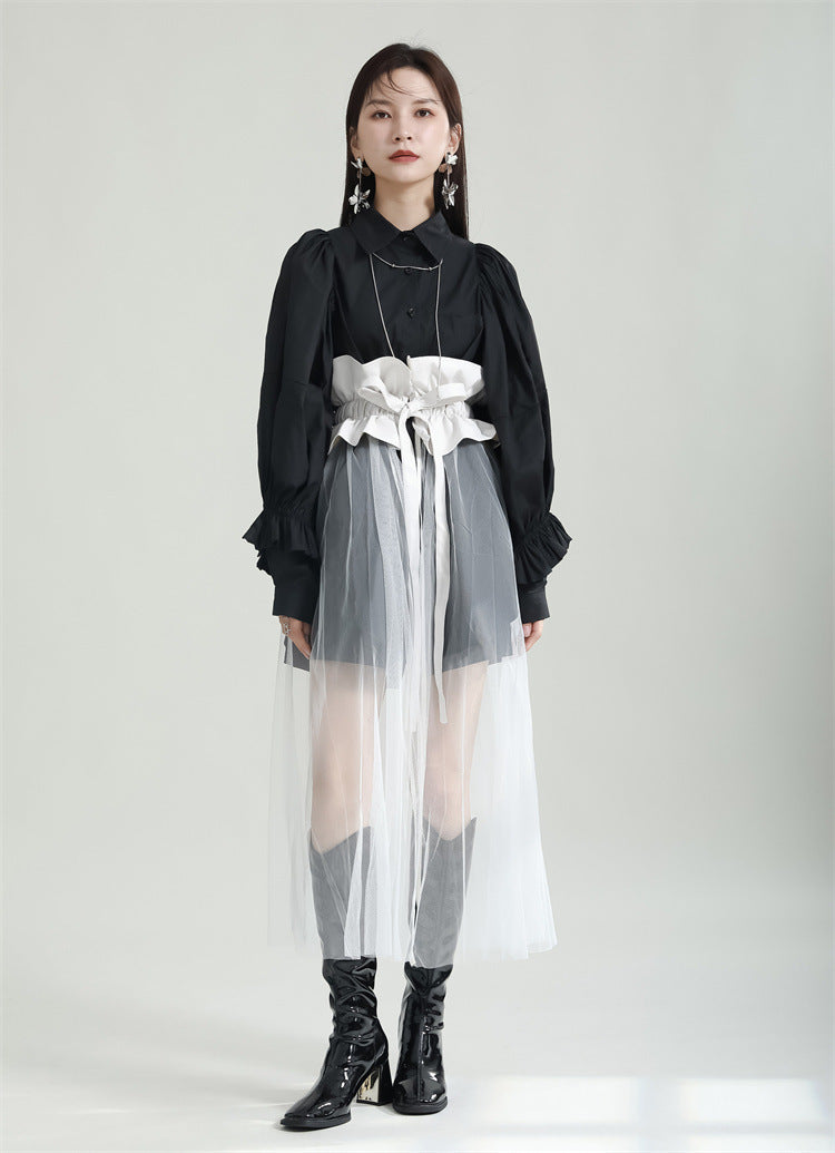 Color: white waist seal gauze skirt, black waist seal gauze skirt, black waist seal shirt white, white waist seal black shirt