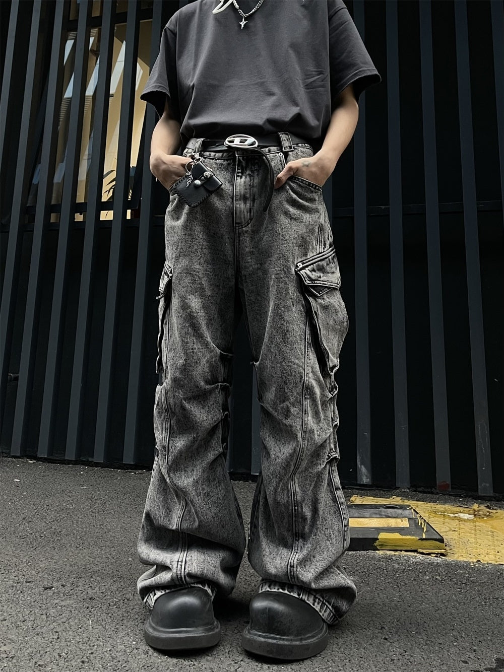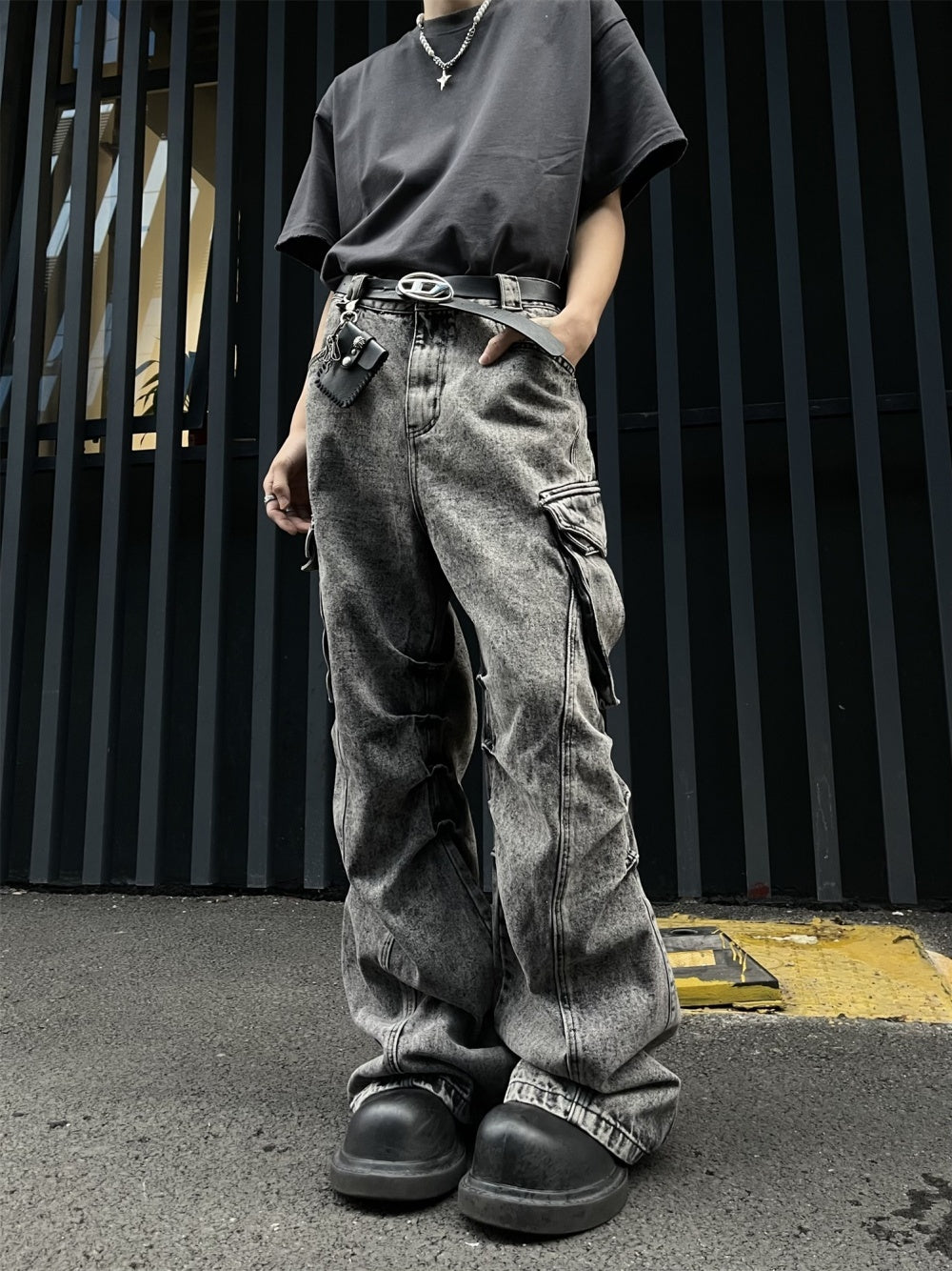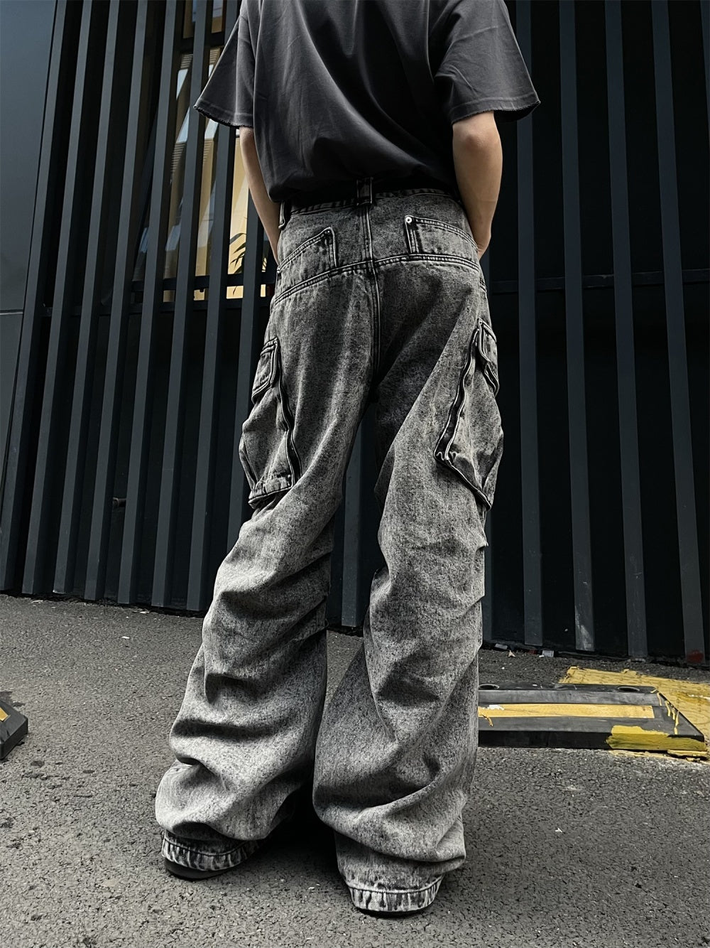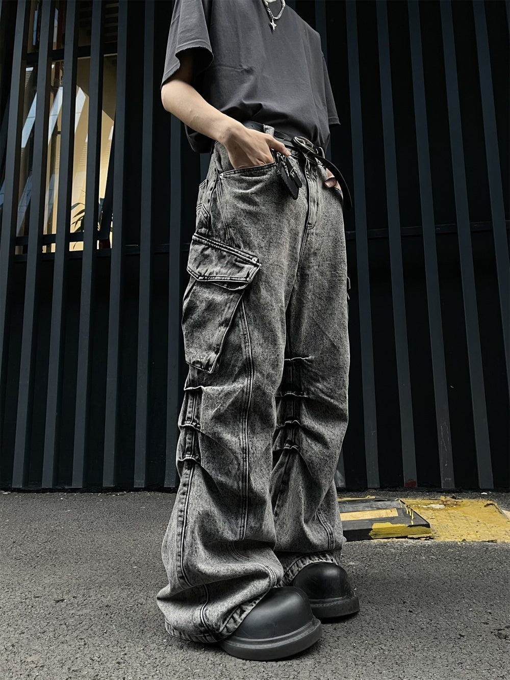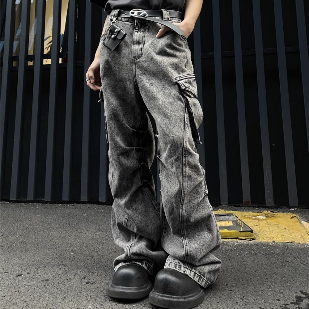 Pleated Workwear With Pocket Jeans Loose-fitting Wide-leg Trousers