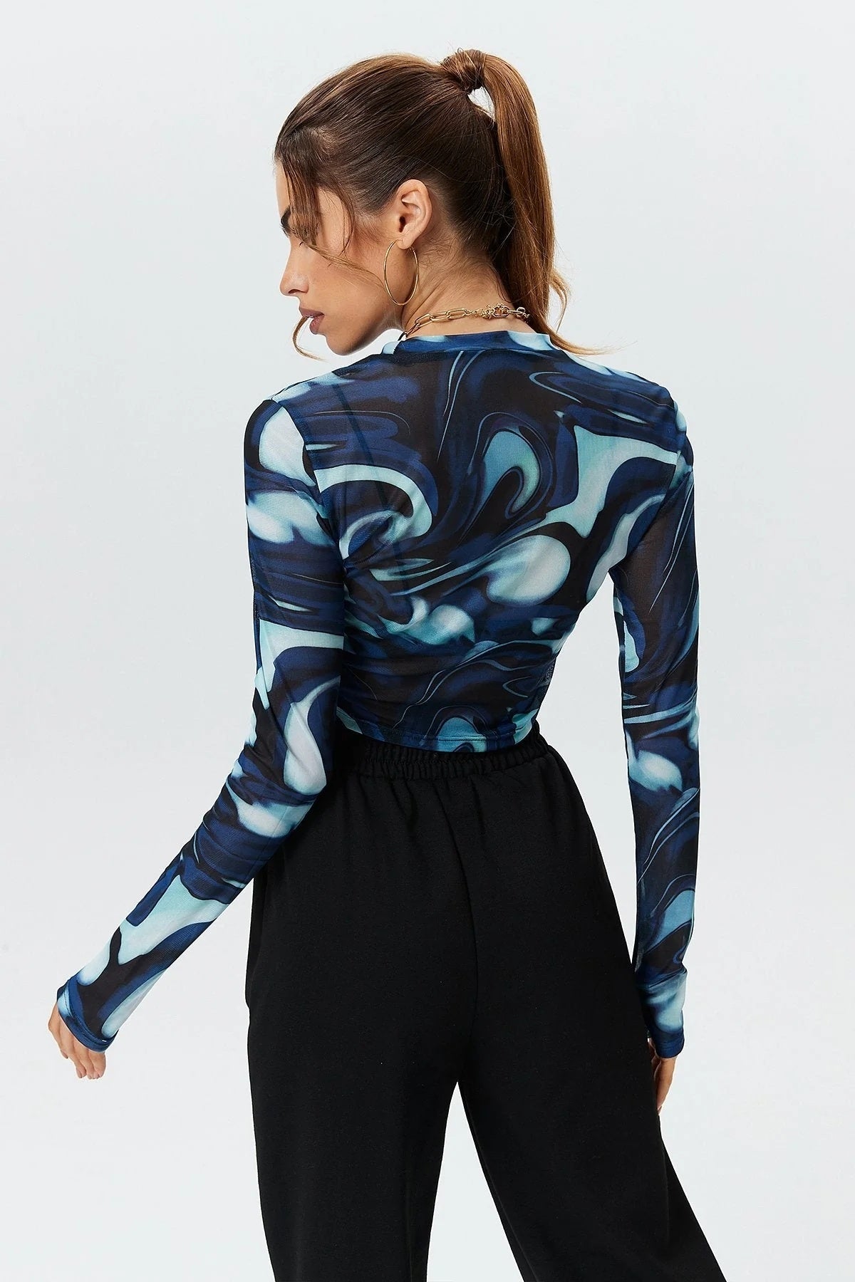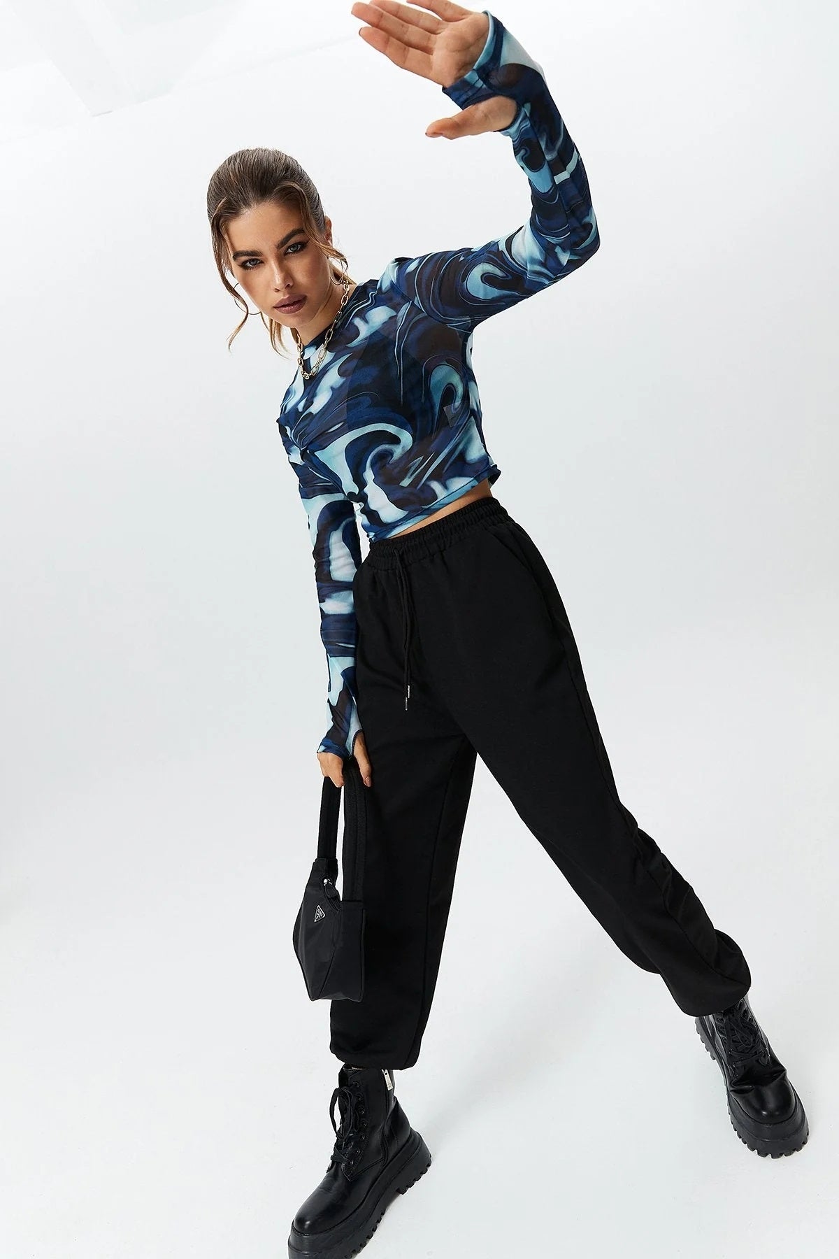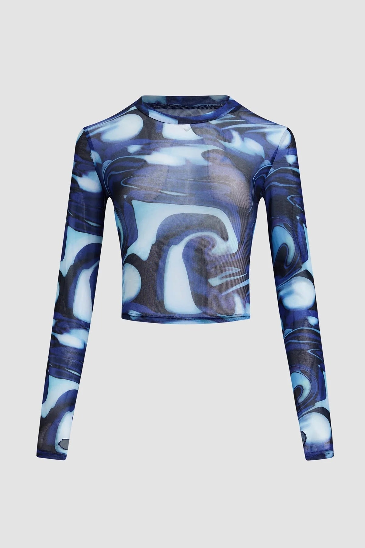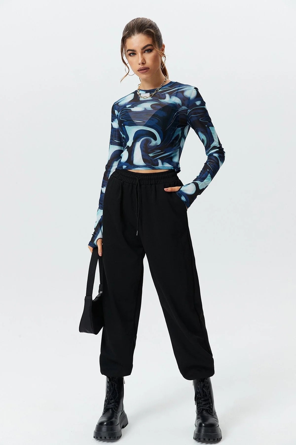 Round Neck Pullover Printed Crop Long Sleeve Top