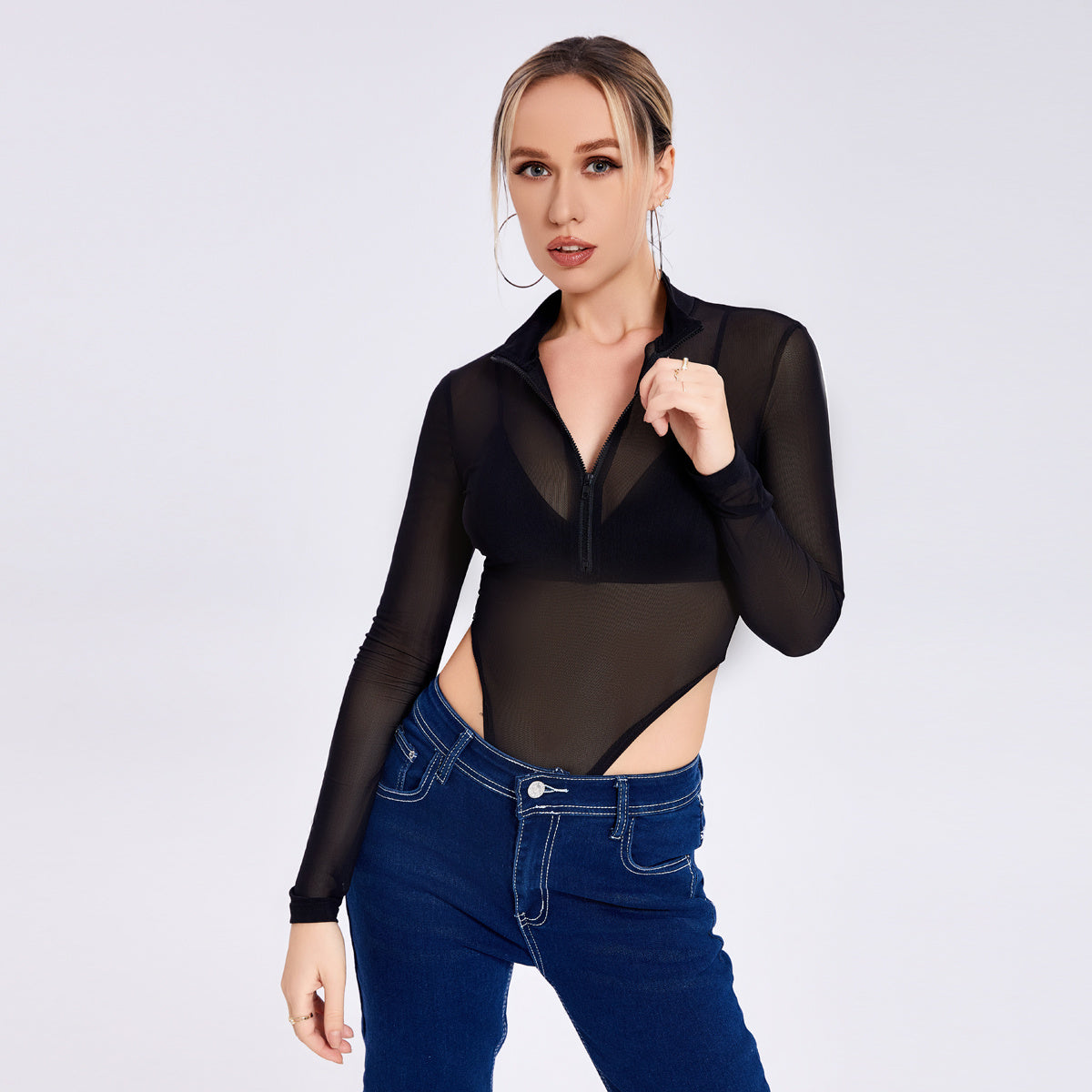 Sexy Perspective High -necked Single -sleeved Mesh Base Top Female Wholesale