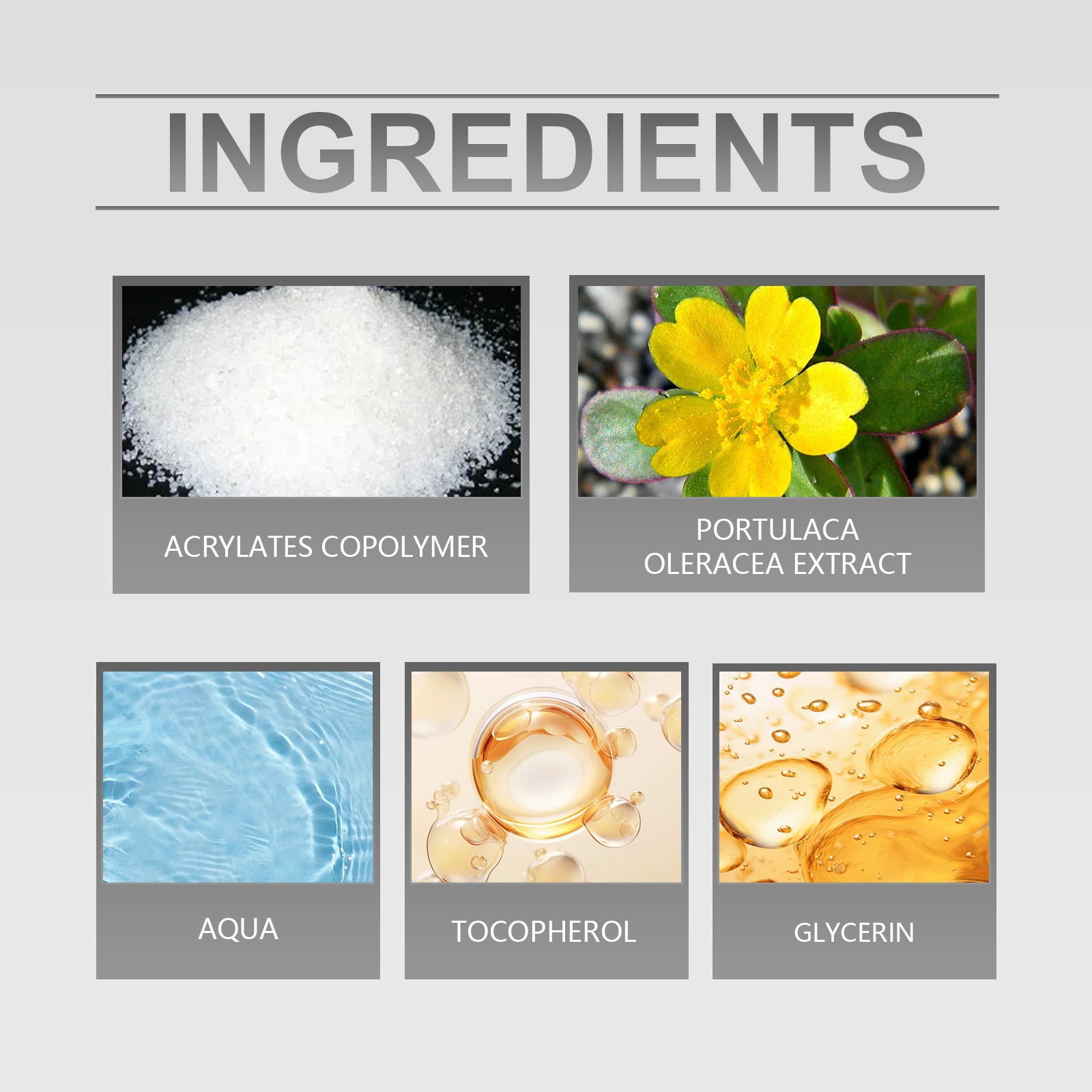 Ingredients: Water, acrylic cool copolymer, glycerin, tocopherol (vitamin E), purslane extract