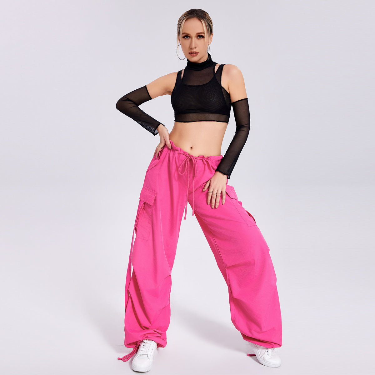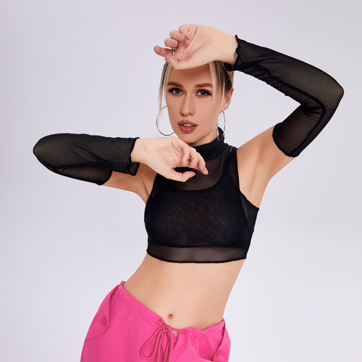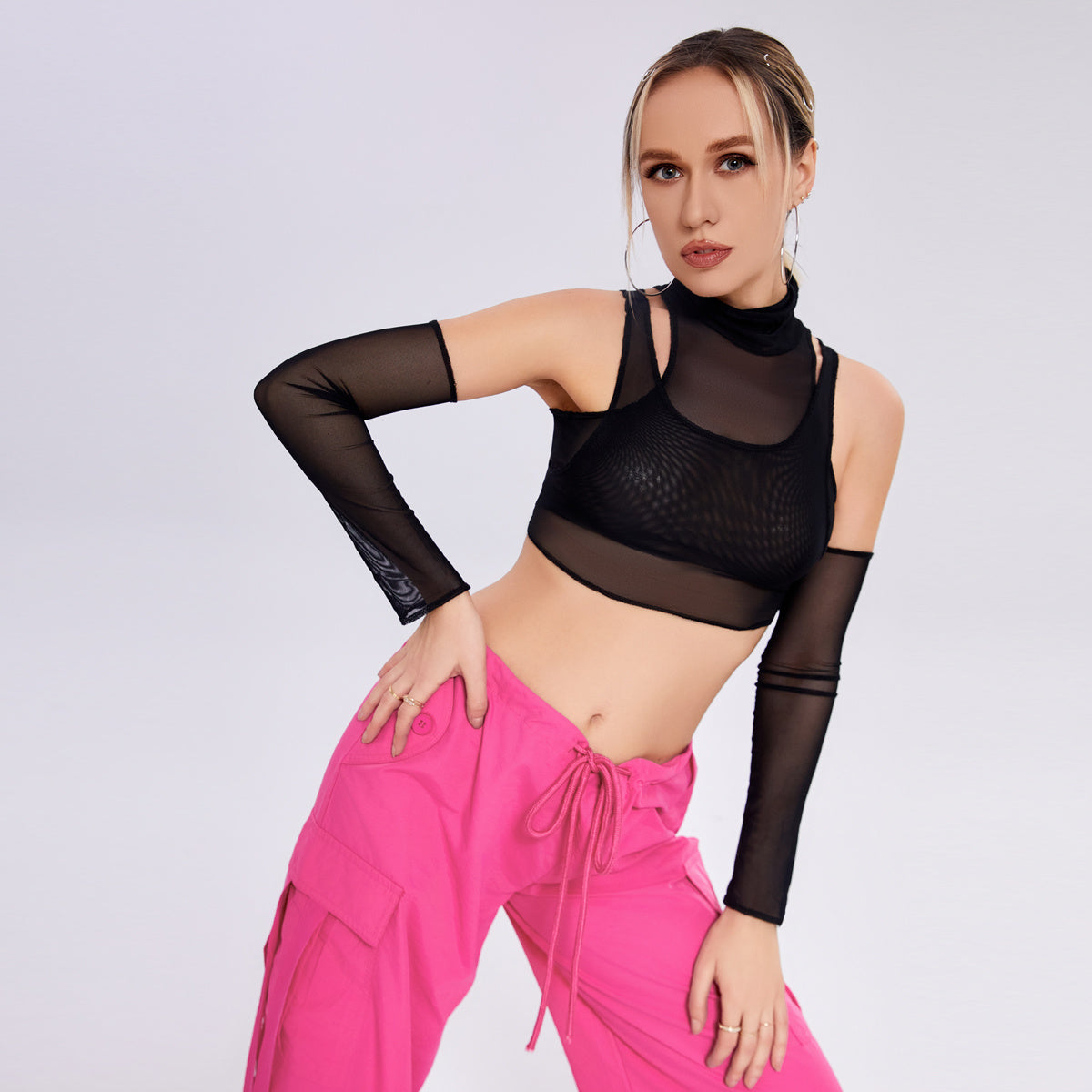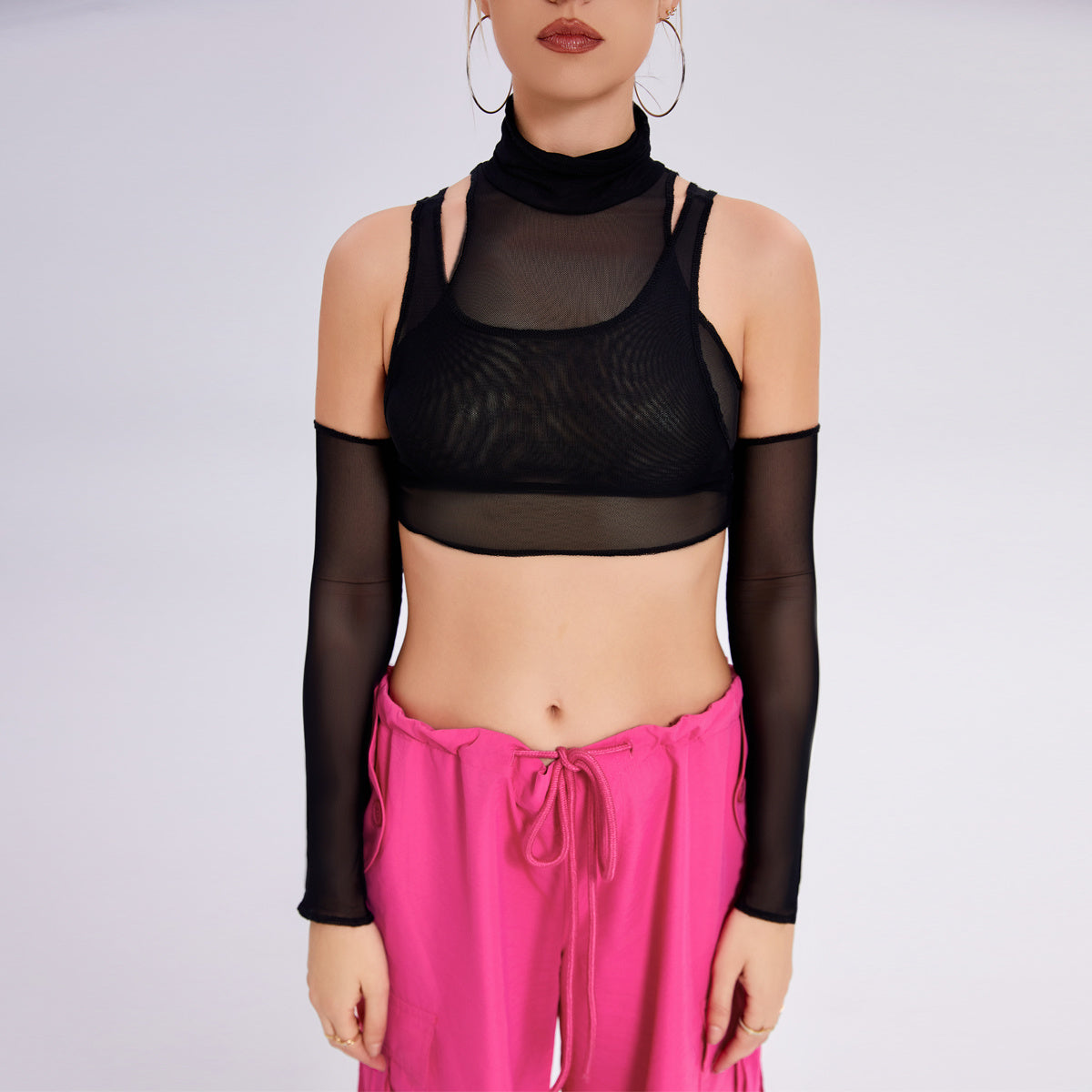 Street Spicy Girl Dew Pure Color Mesh Long Sleeve Top Two Sets