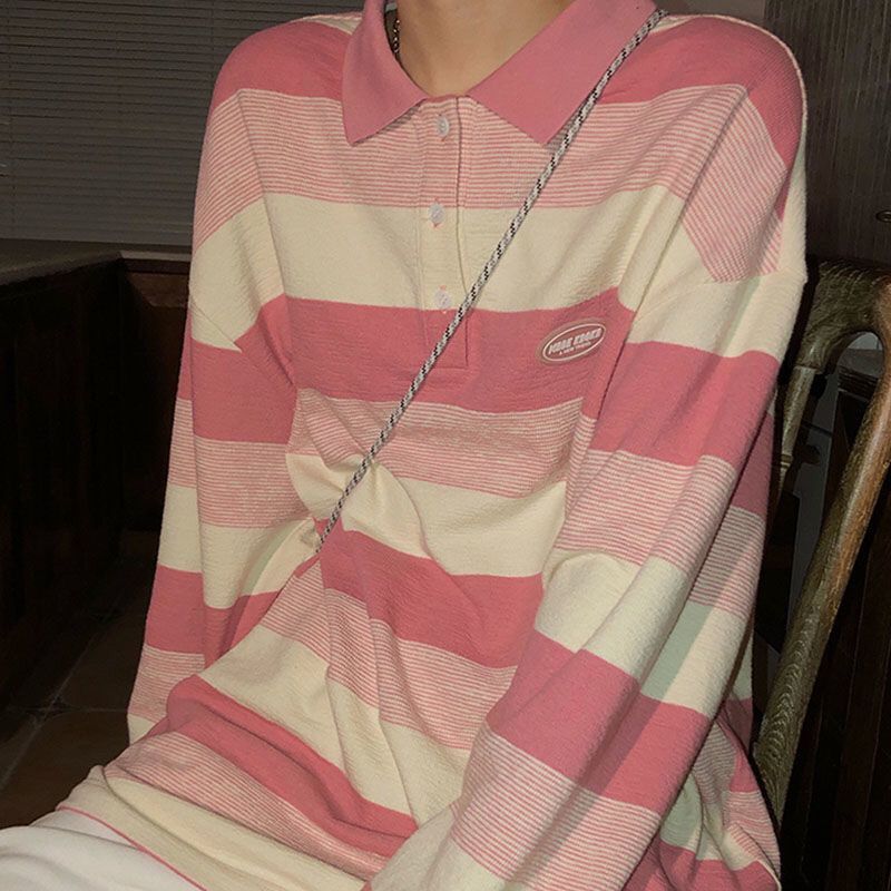 Striped Long-sleeved T-shirt For Women Loose Lapels